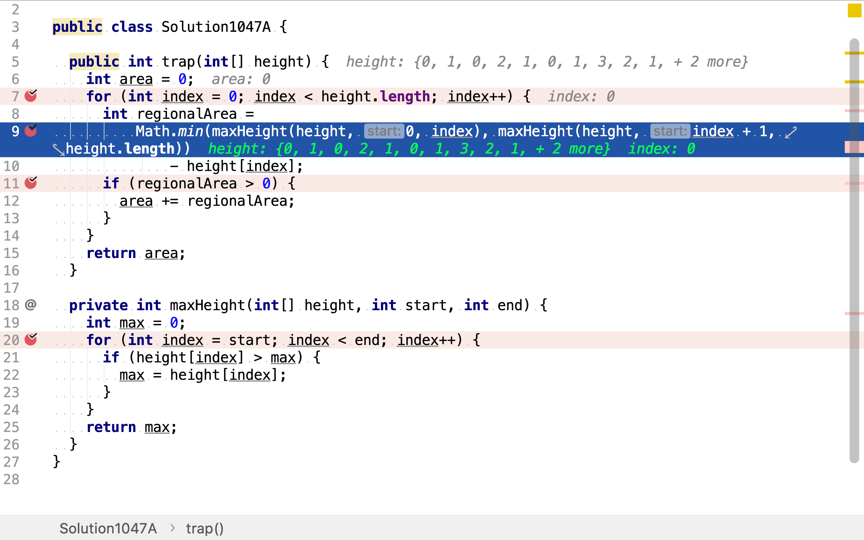本演算法缓存了所有maxHeightOnLeftSide和maxHeightOnRightSide的值。所以空间复杂度是。