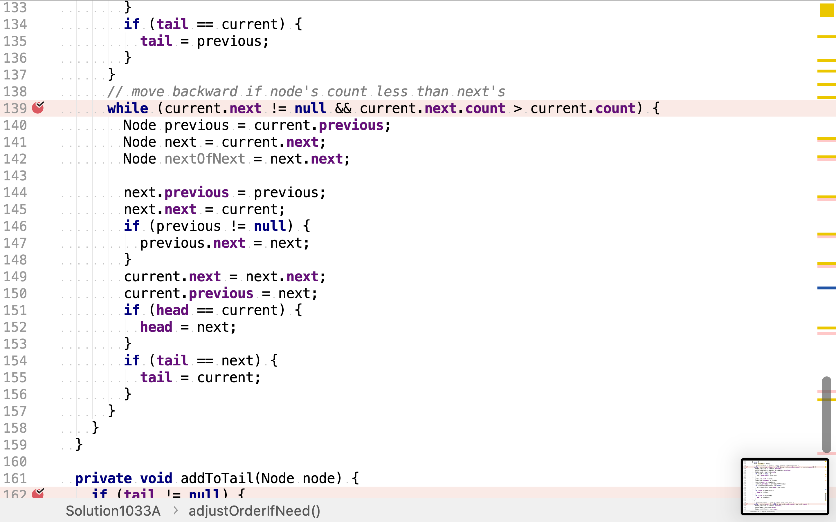 adjustOrderIfNeed时间复杂度与双向链表中节点计数重复度相关。假设所有键的计数都不相同或极少相同,则adjustOrderIfNedd的时间复杂度为常数