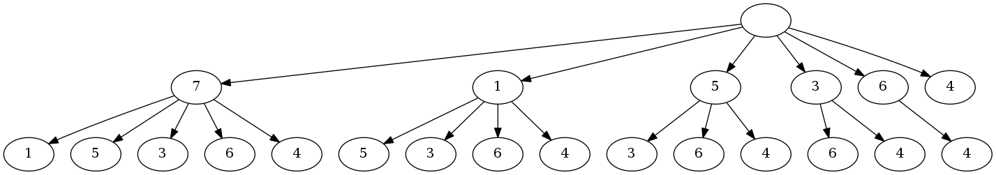举个例子,给定价格序列[7,1,5,3,6,4]。买入价有六种选择。用树表示就是第1层(根节点为第0层)有六个子节点。卖出价的选则受买入点影响。比如,当在第一天买入时,可选的卖出点只能是第二天及以后;当在第二天买入时,可选的卖出点只能是第三天及以后;以此类推。