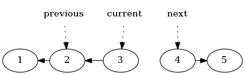 首先,previous指向第一个节点,current指向第二个节点,next指向第三个节点。